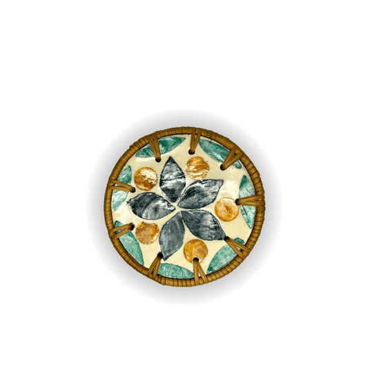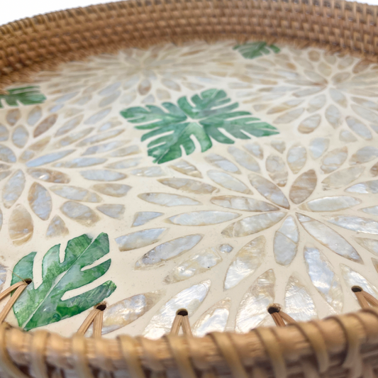 Green Leaf Design Sedef Kaplama Rattan Yuvarlak Tepsi