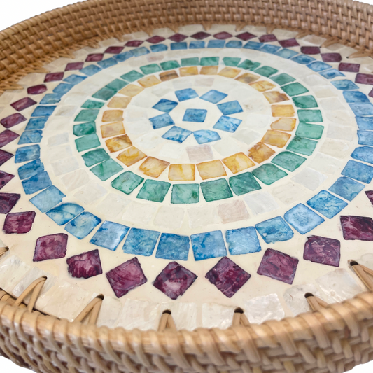 Colourful Design Sedef Kaplama Rattan Yuvarlak Tepsi